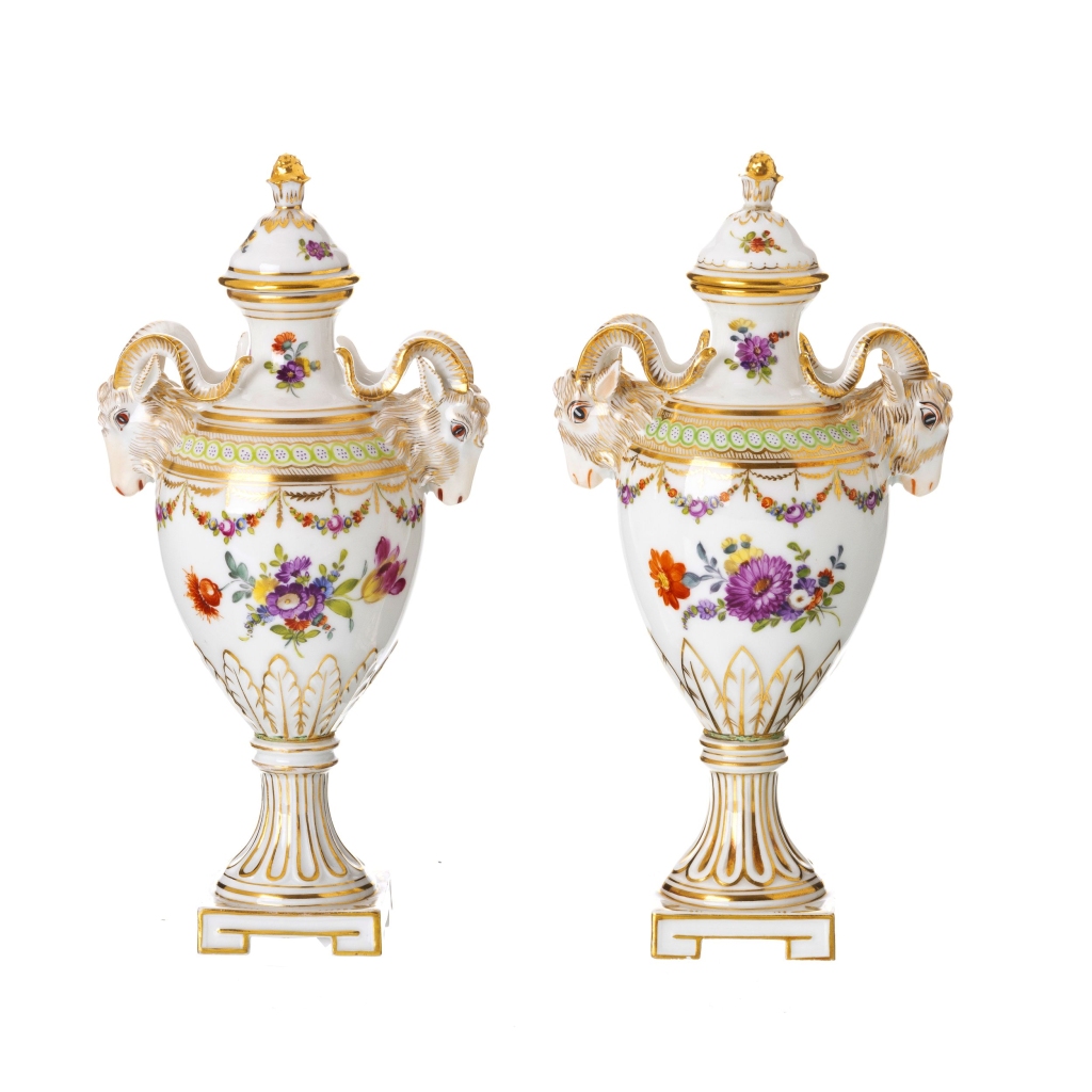 Alemanha, XX, porcelana Dresden, moldada e relevada, polícroma e a ouro de motivos florais, pegas em forma de cabeça de carneiros. Marcadas. Sinais de uso. Dim.:21,5cm.