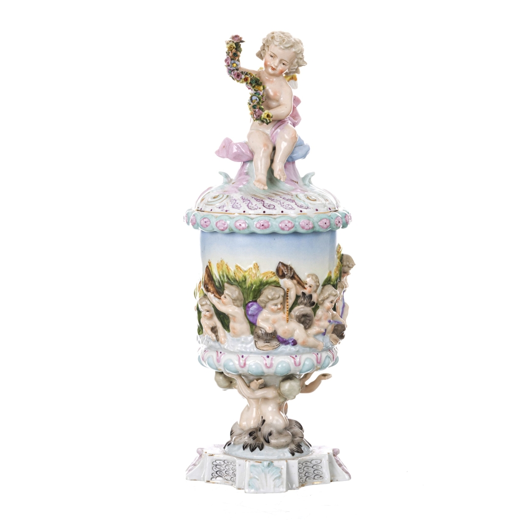 Porcelana italiana, séc. XX, decoração policroma e relevada com querubins. Marcado na base. Dim.:38 cm.