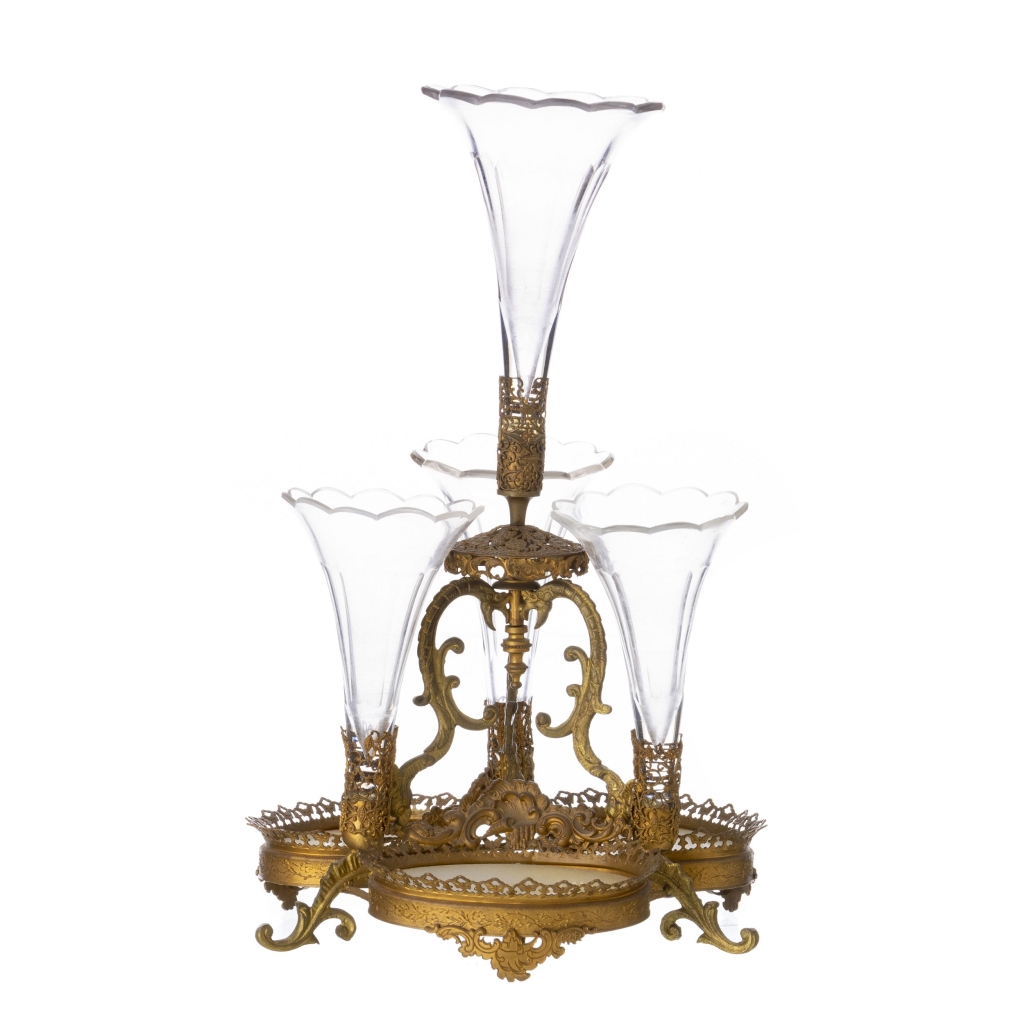 França, séc.XIX, bronze dourado vazado com floreiras em vidro lapidado, aneleiras em mármore. Sinais de uso. Dim.:32,5 cm