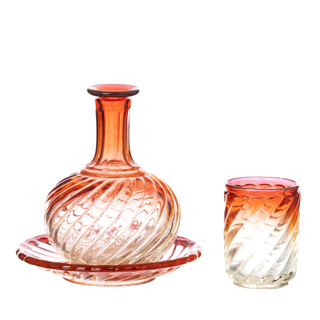 França, cristal lapidado bicolor. Sinais de uso, esbeiçadela na base do copo. Marca no copo 'Baccarat, deposé'. Dim.:10 a 18 cm
