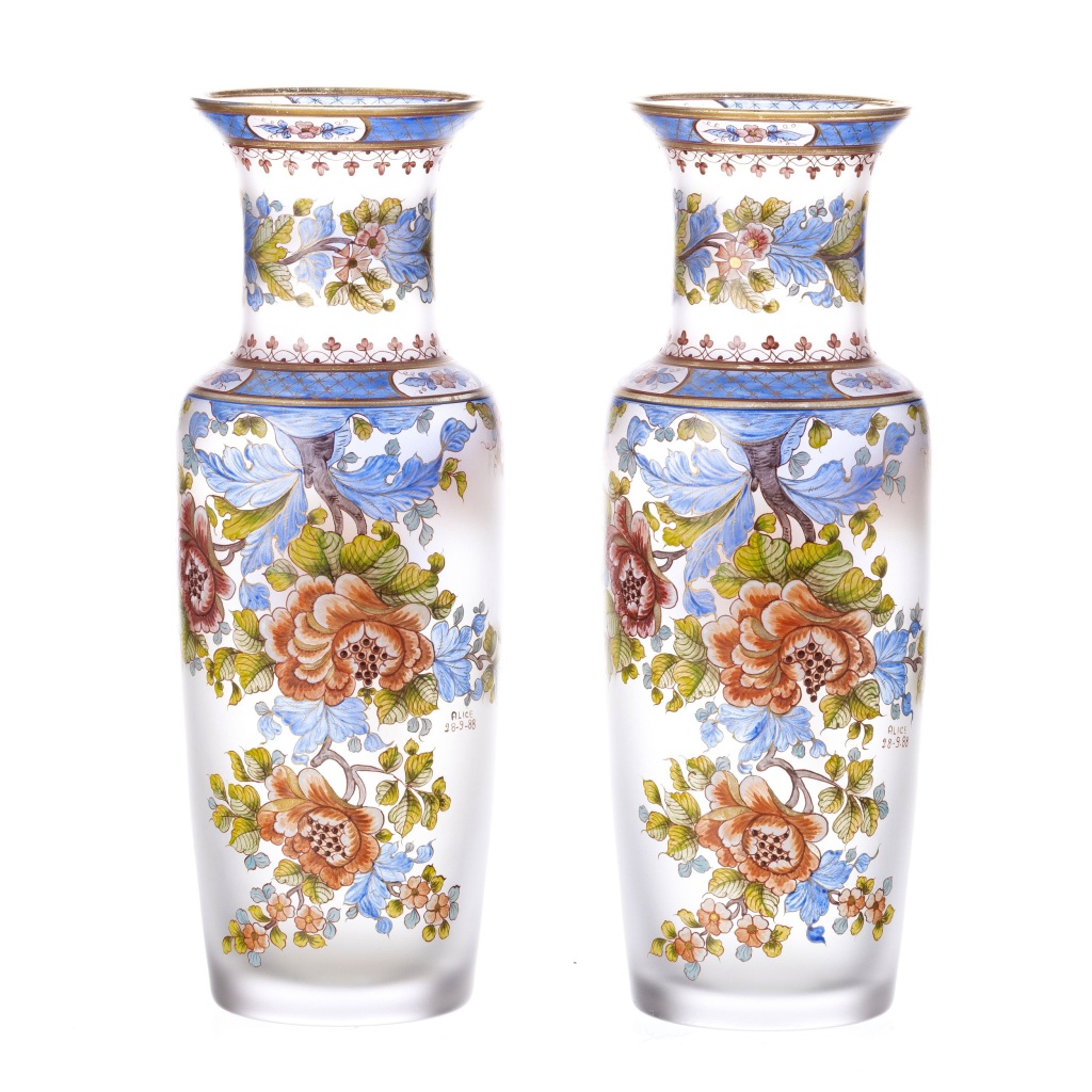 Par de jarras em vidro fosco pintados à mão com decoração polícroma e ouro com motivos florais, marcas possessórias. Marcada Atlantis na base. Dim.:31 cm