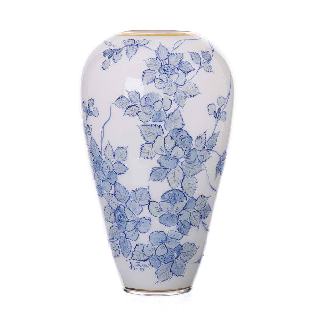 vidro opaco com decoração a ouro no bordo e pintado à mão com motivos florais, Assinada L. Gama e datada de 1989. Sinais de uso.Dim.:35 cm