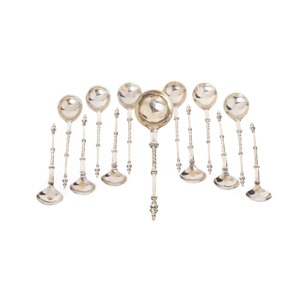 Prata portuguesa, contarste javali II 833 (1887-1937), cabo de torcidos e terminal em pináculo. Sinais de uso. Peso aprox.:124g. Dim.:10,8cm e 13,7cm.