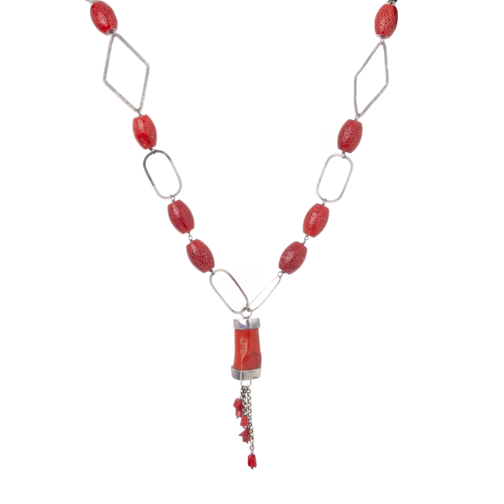 Prata, contraste águia 925, e contas em coral vermelho. Sinais de uso. Peso total:138g. Dim.:49cm.