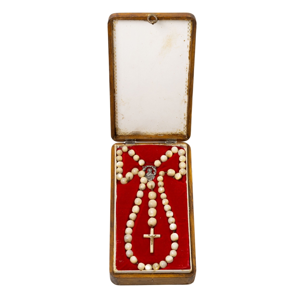 Ibérico, séc.XVIII/XIX, contas em madrepérola com cristo em metal e Nossa Senhora em prata vazada e relevada. Com estojo. Dim.:70cm.