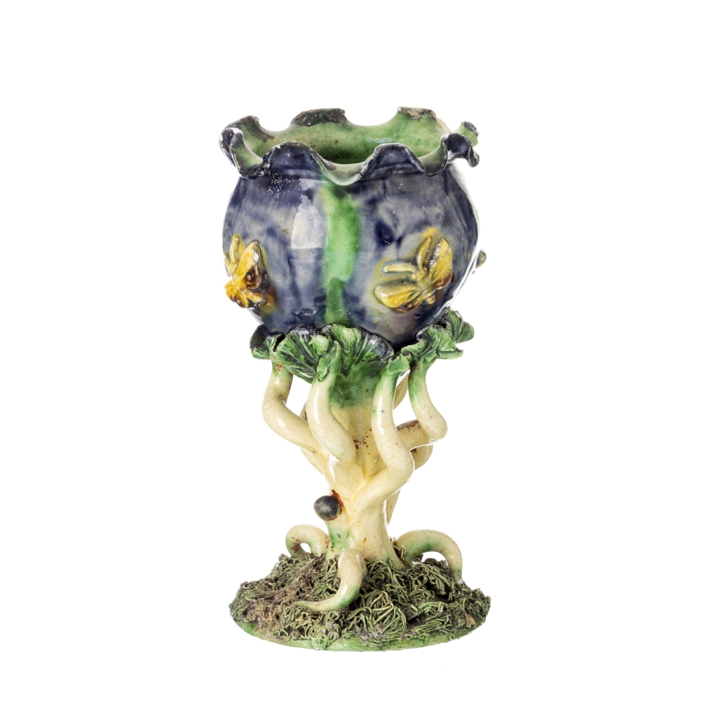 Em faiança vidrada com decoração polícroma, pé em tronco e taça com borboletas. Pequenas falhas e defeitos. Dim.:13 cm