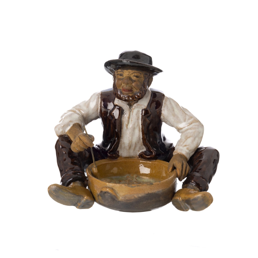 Escultura em faiança das Caldas, séc. XX, com a representação de Zé Povinho a comer papas. Decoração polícroma vidrada e desvidrada. Sinais de uso. Dim.: 10 cm