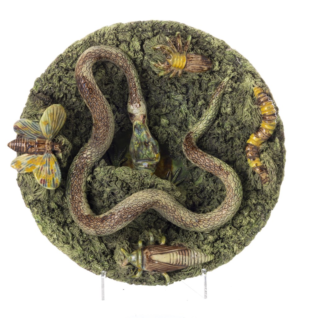 Faiança das Caldas da Rainha, fabrico de José A. Cunha, finais do séc.XIX, decoração polícroma em relevo, representando insectos e cobra. Marcada. Mínimas falhas. Dim.:24 cm