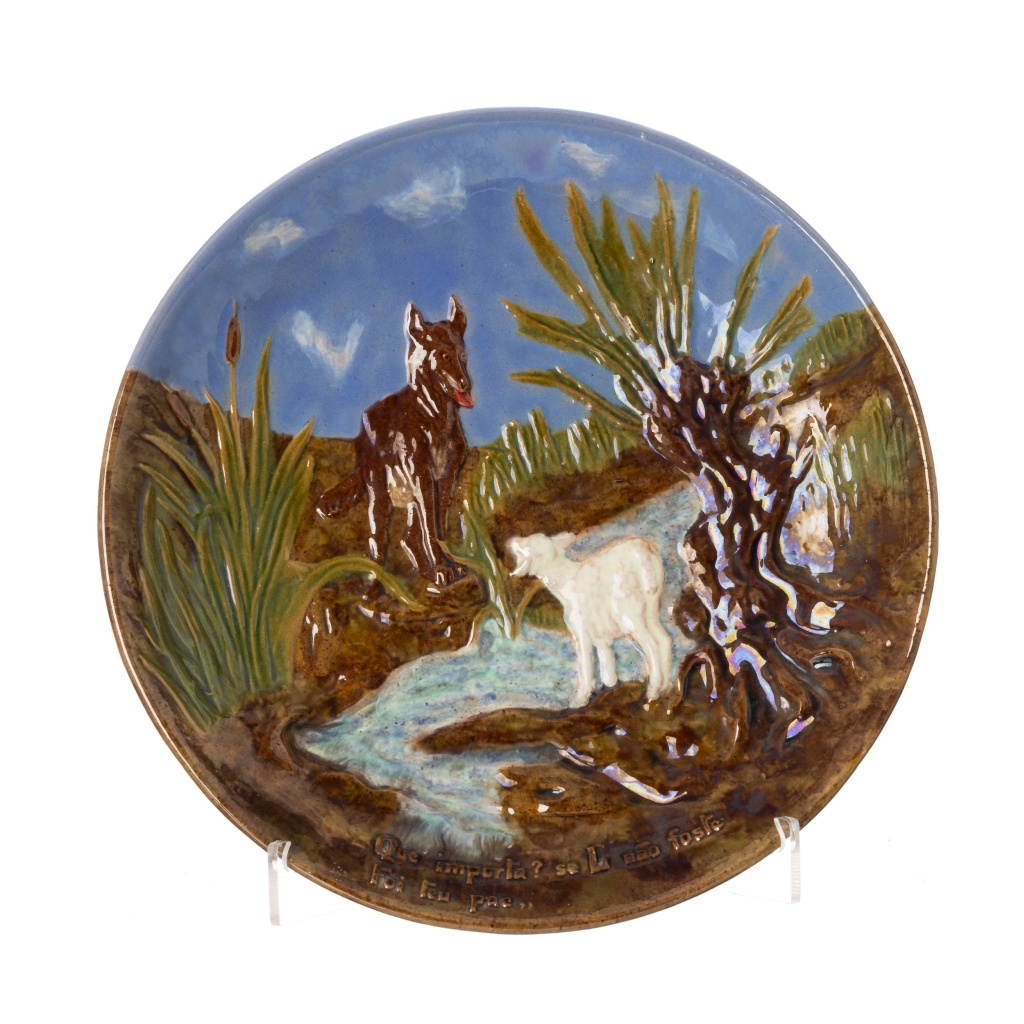 416. Prato 'Fábula Lobo e Cordeiro' em faiança Bordalo Pinheiro