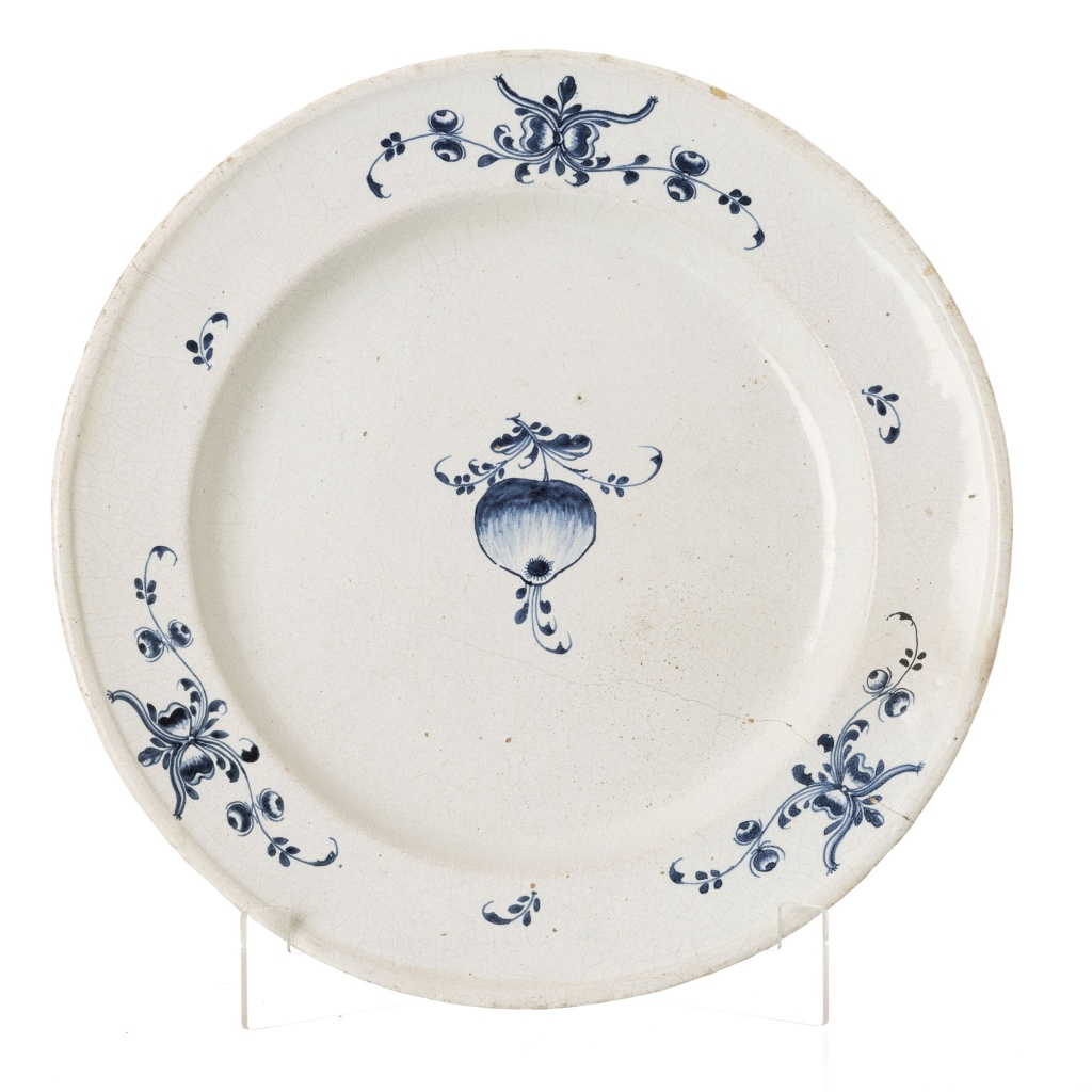 Faiança portuguesa de Viana, séc.XVIII, 1º período, decoração a azul com fruto ao centro. Marcada na base.cabelos, gateados. Dim:38,5 cm