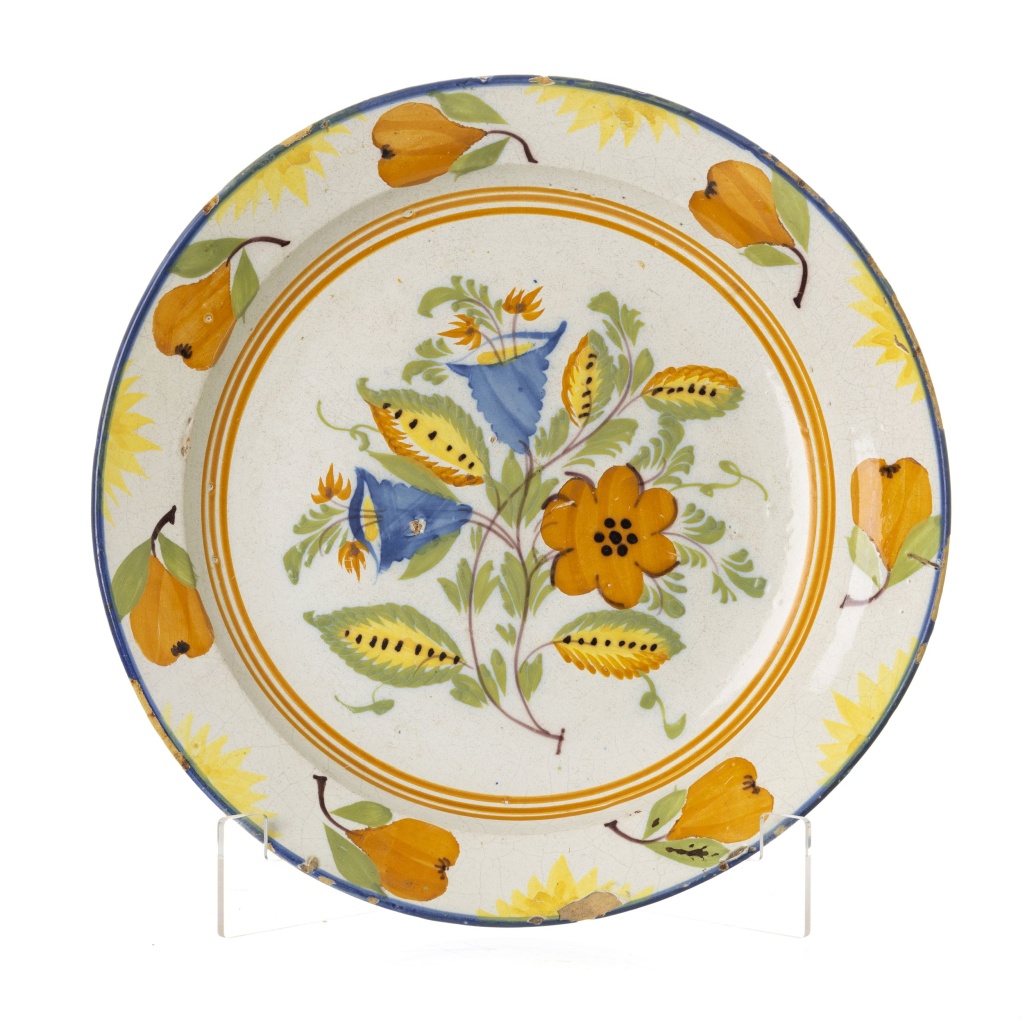 Faiança portuguesa, séc.XIX, atribuível a Fervença, decoração polícroma floral, aba com pêras. Mínmas falhas no bordo, craquelê. Dim.: 34 cm