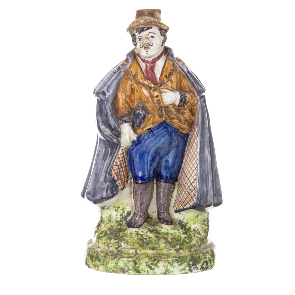 Garrafa em faiança portuguesa, atribuível a Gaia, séc.XIX, decoração polícroma representando figura masculina 'janota'. Inscrição na base Manuel Tejo. Sinais de uso. Pequenos restauros. Dim.:31 cm