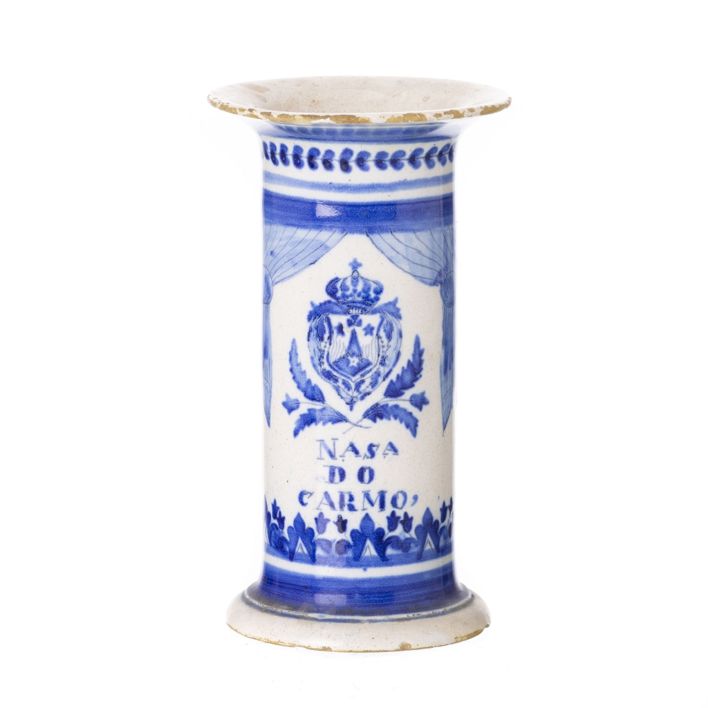 Faiança portuguesa, fabrico atribuível a Gaia, séc.XIX, decoração a azul vidrada, de motivos vegetalistas, com inscrição 'Nª Sª do Carmo' e brasão de armas da Ordem do Carmo. Sinais de uso, e falhas. Dim.: 19 cm.