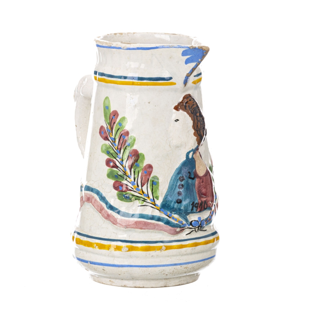Faiança Portuguesa, séc. XX, atribuível a Porto ou Gaia, decoração vidrada e polícroma com figura feminina e alusivo ano 1910 representativo da implantação da República. Sinais de uso. Dim.:22 cm