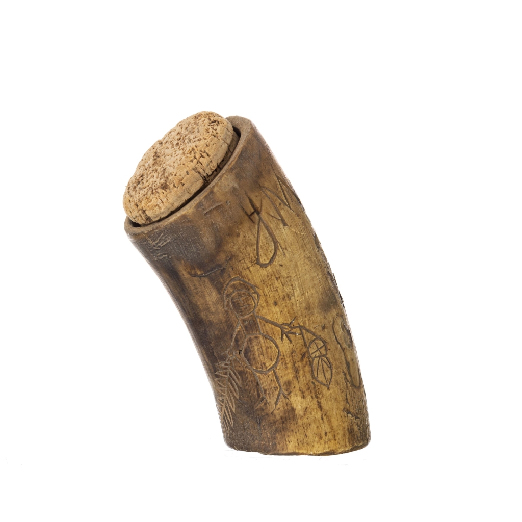 Portugal, séc.XX, recipiente para farnel, chifre de boi, decoração gravada com figura e inscrições 'FOP e JM', extremos em cortiça. Dim.:14 cm
