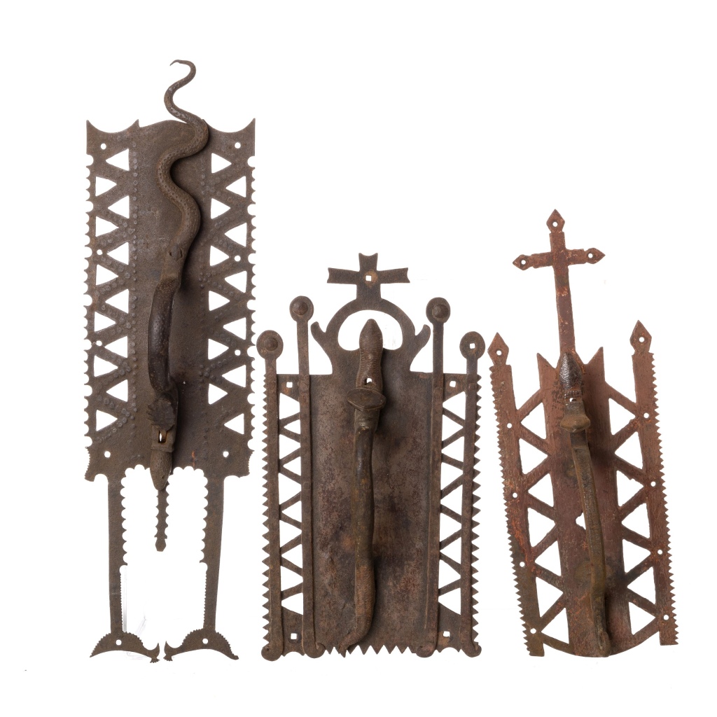 Portugal, séc.XIX, ferro batido, vazado, recortado e relevado, com serpentes, aves e cruzes. Sinais de uso e ferrugem. Dim.: de 28cm a 41,5cm.