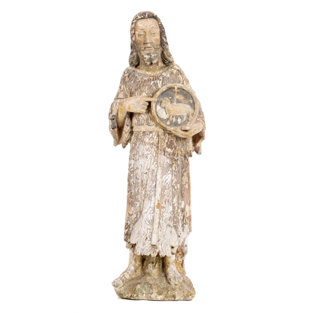 Portugal, séc.XVII, escultura em pedra ancã polícroma, representando Cristo segurando placa circular alusiva ao Cordeiro. Gasto da policromia, pequenos defeitos, consolidações. Dim.:111cm.