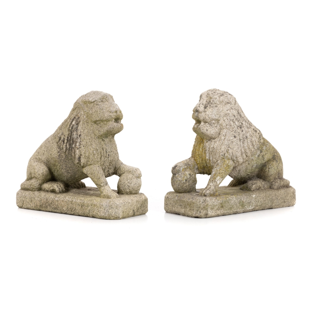 Portugal, séc.XVIII, par de esculturas de leões em granito, segundo modelo de Medicis. Sinais de uso, fraturado numa das patas. Dim.:44 cm