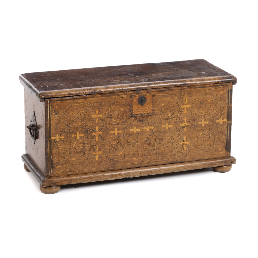 Portuguesa, séc. XVII, pau santo com embutidos em espinheiro, de decoração vegetalista, ferragens em ferro. Sinais de uso, vestígios de xilófagos. Dim.:44x88x36 cm