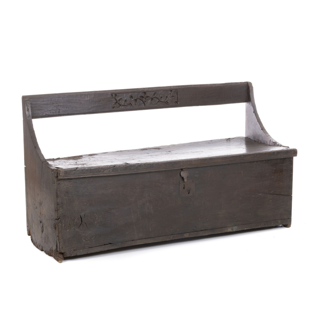 Portugal, séc.XVII, madeira entalhada, costas com decoração relevada com motivos vegetalistas, assento abre em baú, com ferragens em metal. Faltas e defeitos, vestígios de xilófagos. Dim.:92x168x58cm.