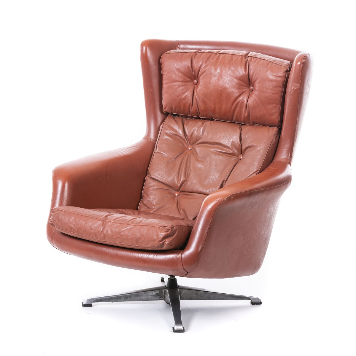 Nórdico, c.1970, estofo em pele, estrutura em metal, rotativo. Sinais de uso. Dim.:90x79x70cm.