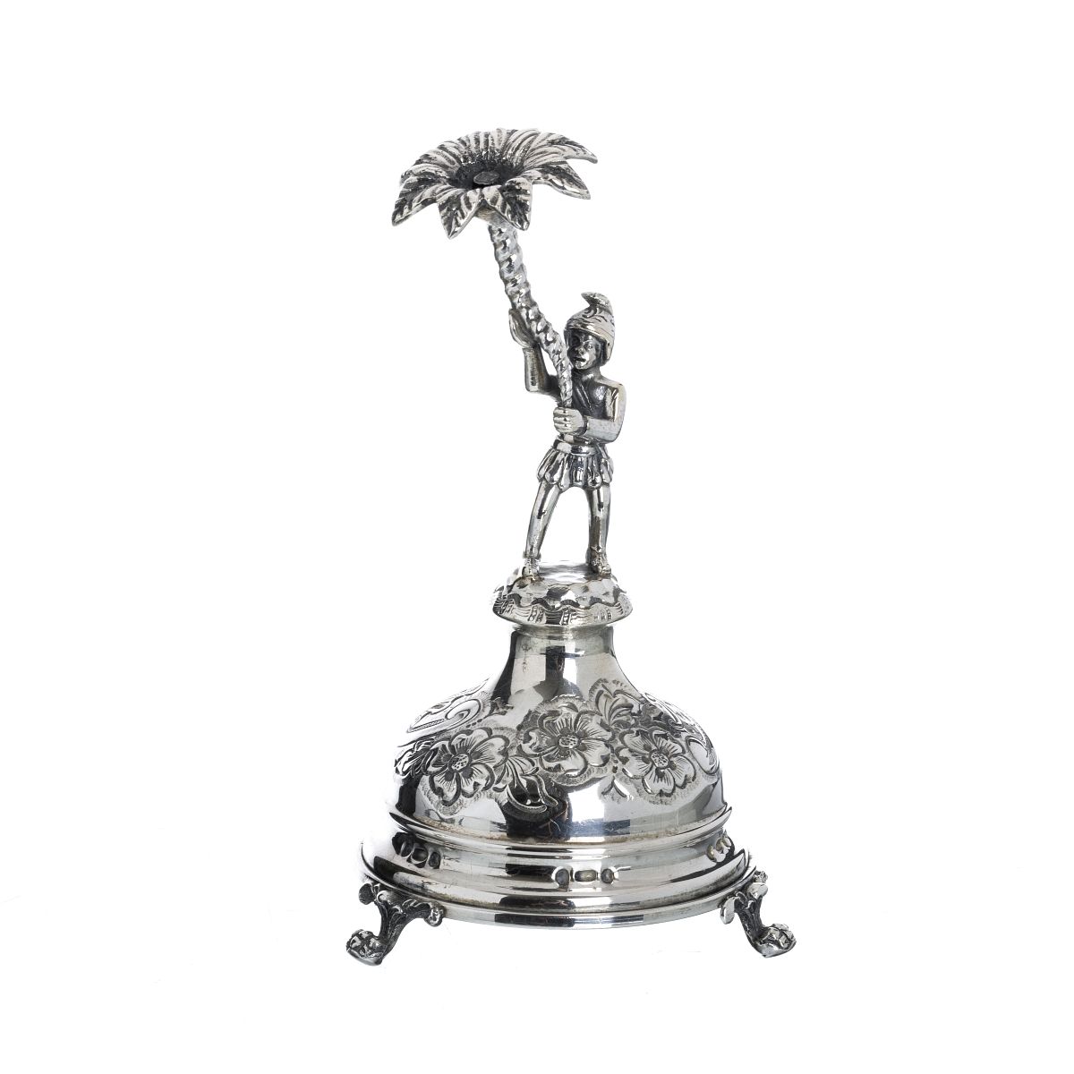Prata portuguesa, contraste águia 835 (após 1985), decoração incisa e relevada com figura segurando flor, base redonda floral com três pés de garras com bola. Sinais de uso. Peso aprox.:122g. Dim.:15cm.