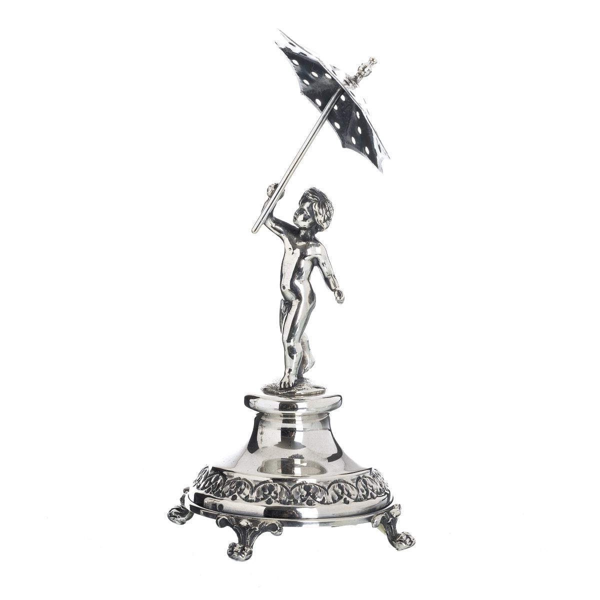 Prata portuguesa, contraste águia 835 (após 1985), decoração relevada representando menino com guarda-chuva, base circular com pés de garra. Peso aprox.:151g. Dim.:17,5cm.