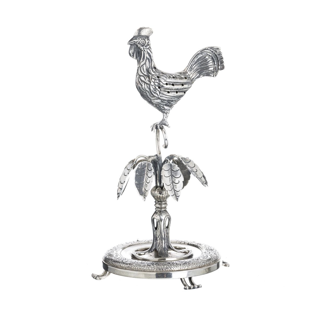 Prata portuguesa, contraste águia 835 (após 1985), decoração incisa e cinzelada representando galinha sobre folhagem. Sinais de uso. Peso aprox.:229g. Dim.:18,5cm.