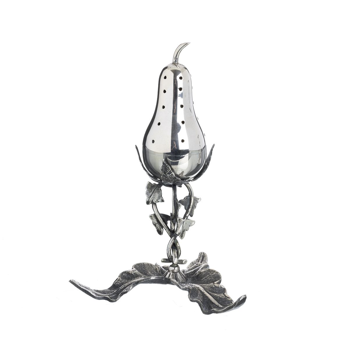 Prata portuguesa, contraste águia 833 (1938-1984), decoração recortada e cinzelada, representando pera, base e pé em forma de folhas. Sinais de uso. Peso aprox.:157g. Dim.:16cm.
