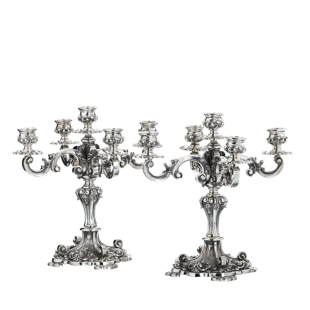 Prata portuguesa, contraste águia 833 (1938-1984), marca de ourives 'Reis, Porto', de cinco lumes, decoração relevada de volutas e concheados, estilo D. João V. Sinais de uso. Peso aprox.:3688g. Dim.:28,5cm.