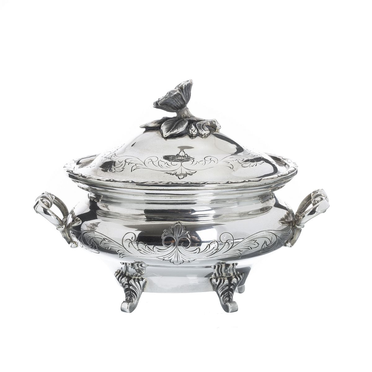 Prata portuguesa, contraste águia 925 (após 1985), decoração incisa com volutas e cinzelada com pomo em forma de flor. Sinais de uso. Peso aprox.:276g. Dim.:12,5cm.