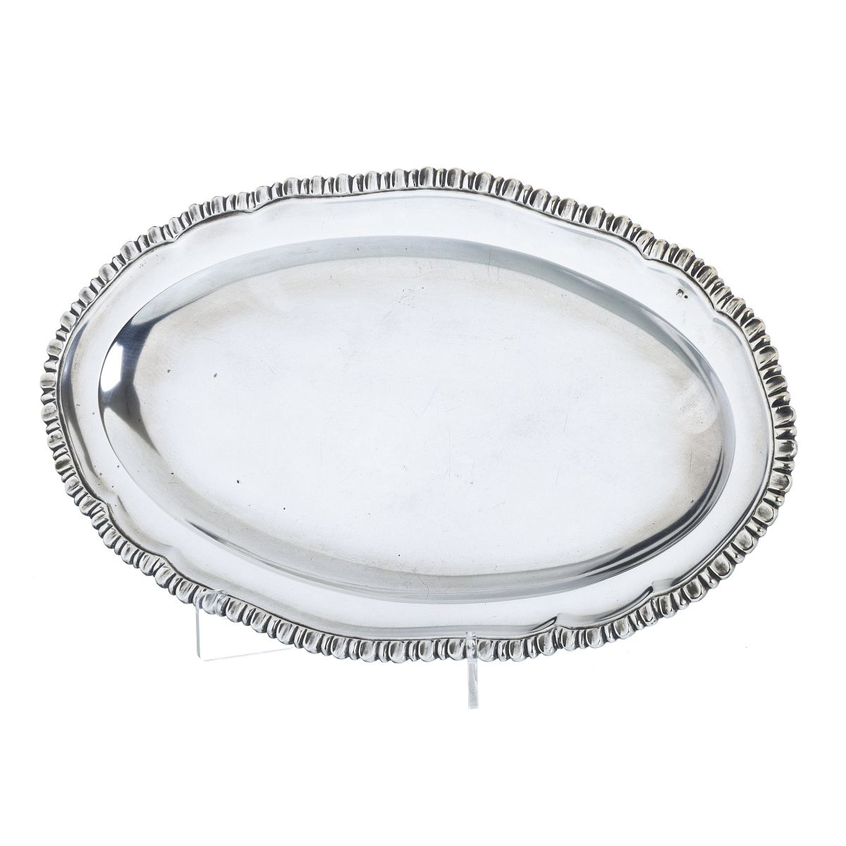 Prata portuguesa, contraste águia 833 (1938-1984), oval com bordo gomade e relevado com godrões. Sinais de uso. Peso aprox.:608g. Dim.:35,5cm.