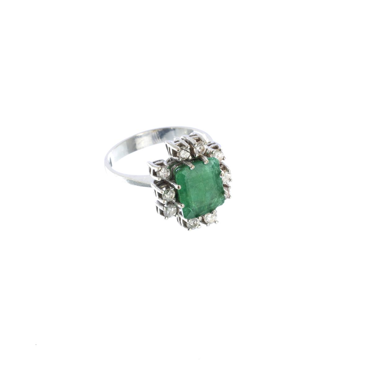 Ouro branco, com 10 diamantes lapidação brilhante redondo, pureza SI-P, cor I-K, com peso estimado de 0,30ct. E uma esmeralda lapidação baguete com aproximadamente 8,0x7,2mm. Peso total: 5,0g. Med.:10. Sinais de uso. Ao abrigo DL 120/2017.