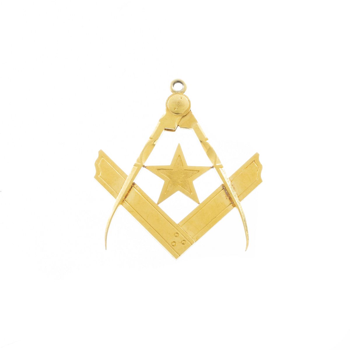 Ouro inglês, 750, Sheffield 1874, representando esquadro e compasso com estrela de 5 pontas no interior. Sinais de uso. Peso aprox.:17,7g. Dim.:5,3cm.