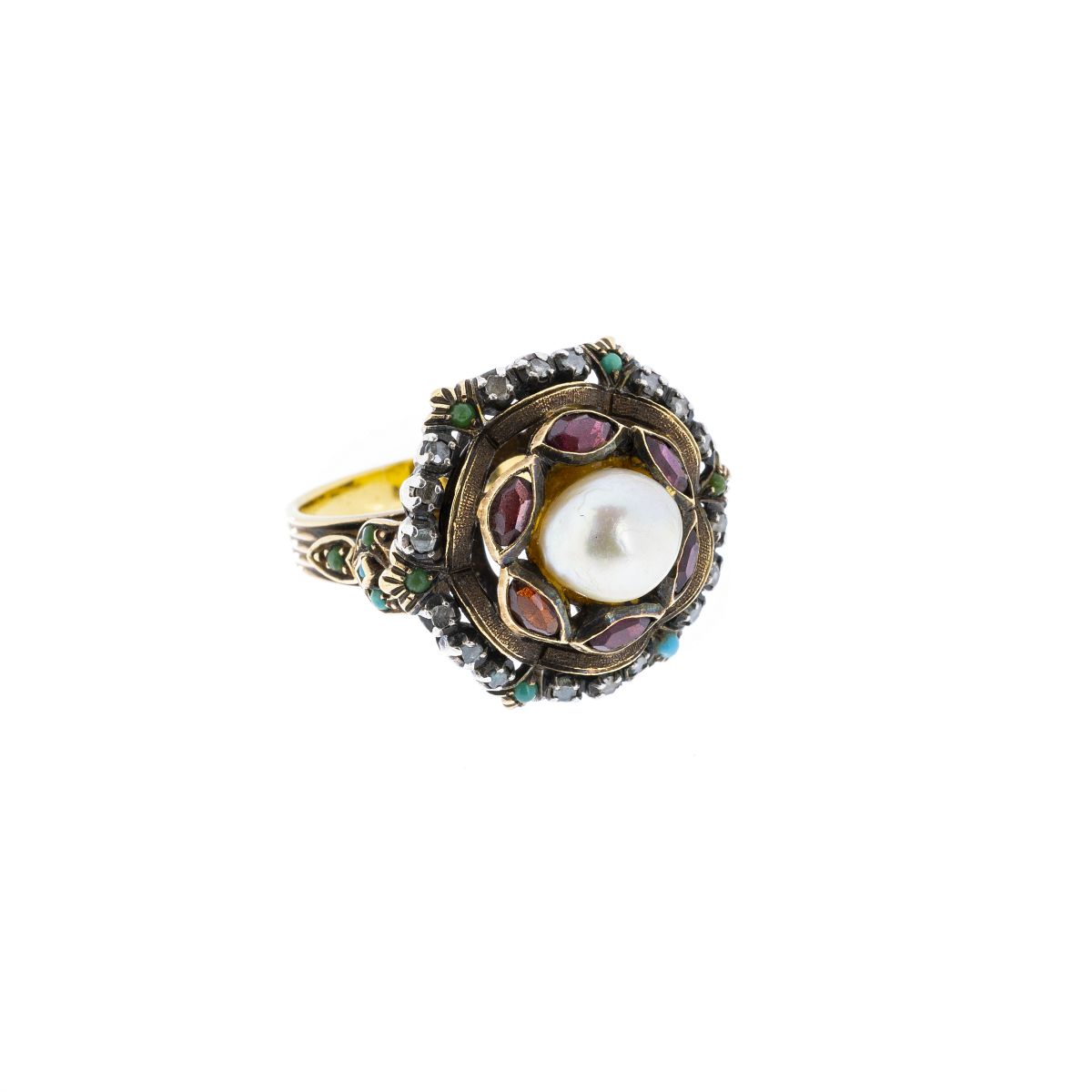 Ouro 800 e prata 833, contrastes cão e galo, com seis ganadas, 18 diamantes 'lascas', 12 turquesas e uma pérola de cultura. Sinais de uso. Peso total:9,2g. Med.:14.