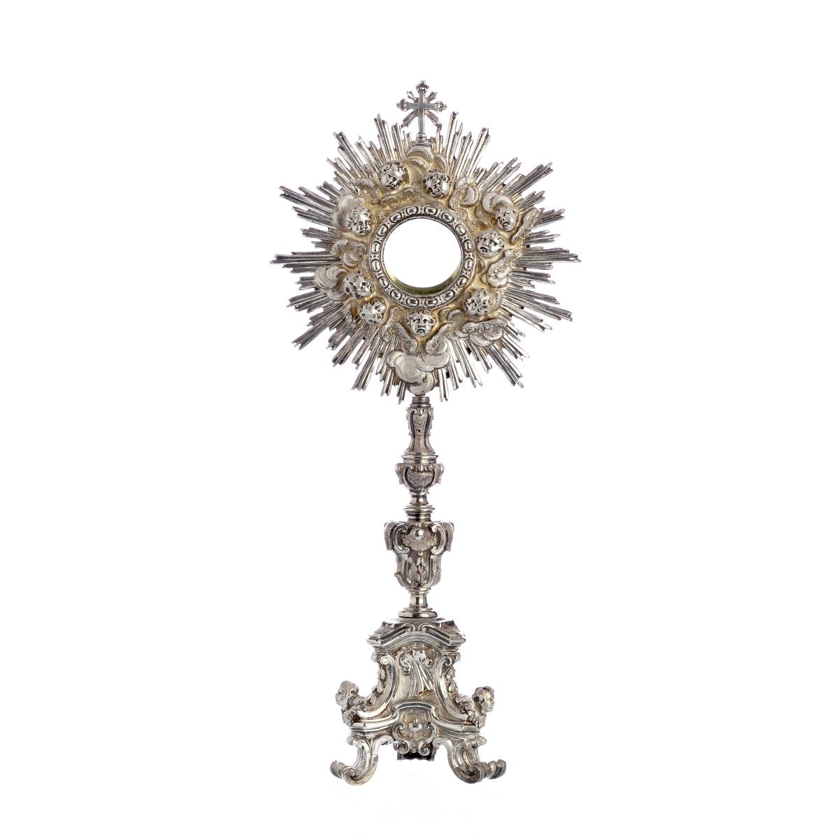 Roma, séc.XVII, em prata relevada e recortada, com cabeças de anjos aladas, símbolos, conchas, resplendor recortado, nicho ostensóris com vidro, suporte de óstea em prata dourada. Sinais de uso. Peso total:721g. Dim.:40cm. Ao abrigo do DL nº120/2017.