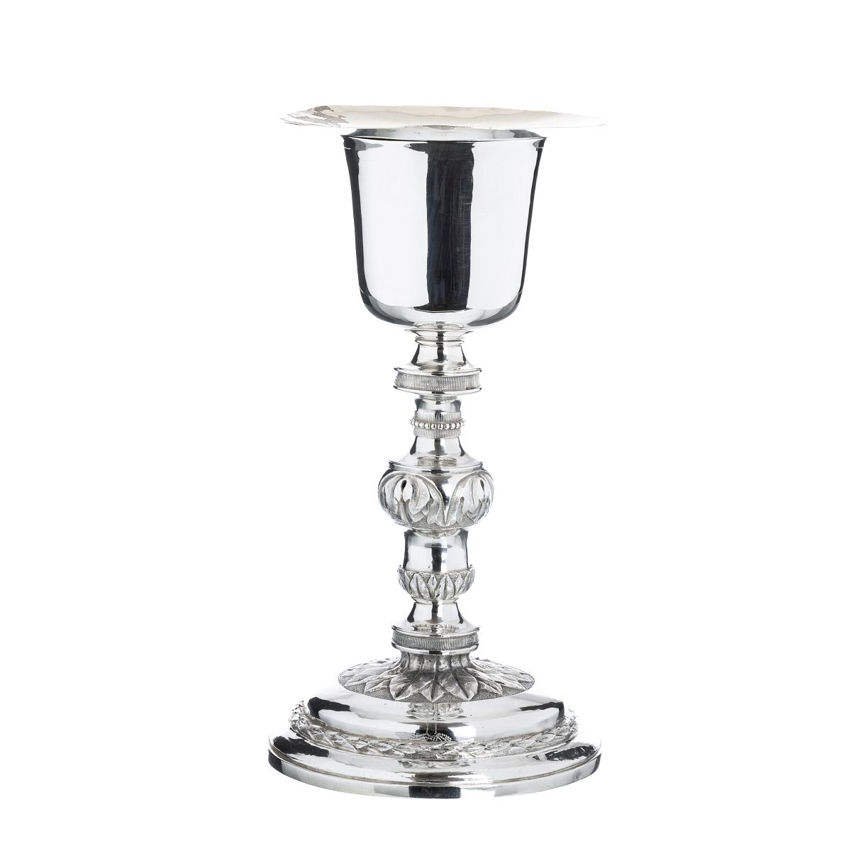 Prata e prata dourada francesa, patena com contraste Minerva 950, marca de ourives 'Demarquet Frères' (1889-1939), inciso com cruz gótica, cálice contraste cabeça de águia, decoração relevada de elementos vegetalistas. Peso aprox.:497g. Dim.:27,5cm.