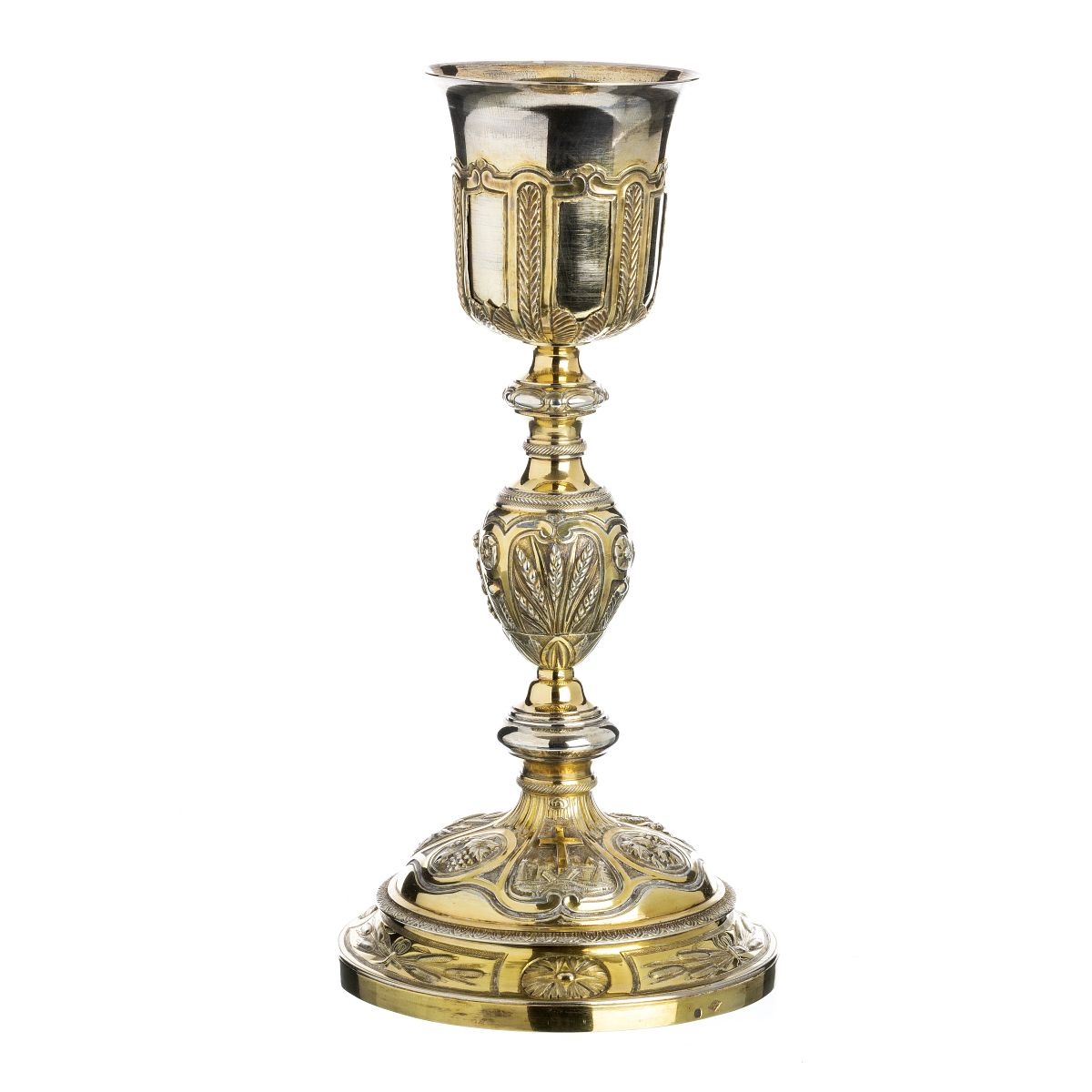 Prata dourada francesa, contraste Minerva 950, marca de ourives, decoração relevada de uva e parra, trigo, crucifixo. Sinais de uso. Peso aprox.:437g. Dim.:28,5cm.