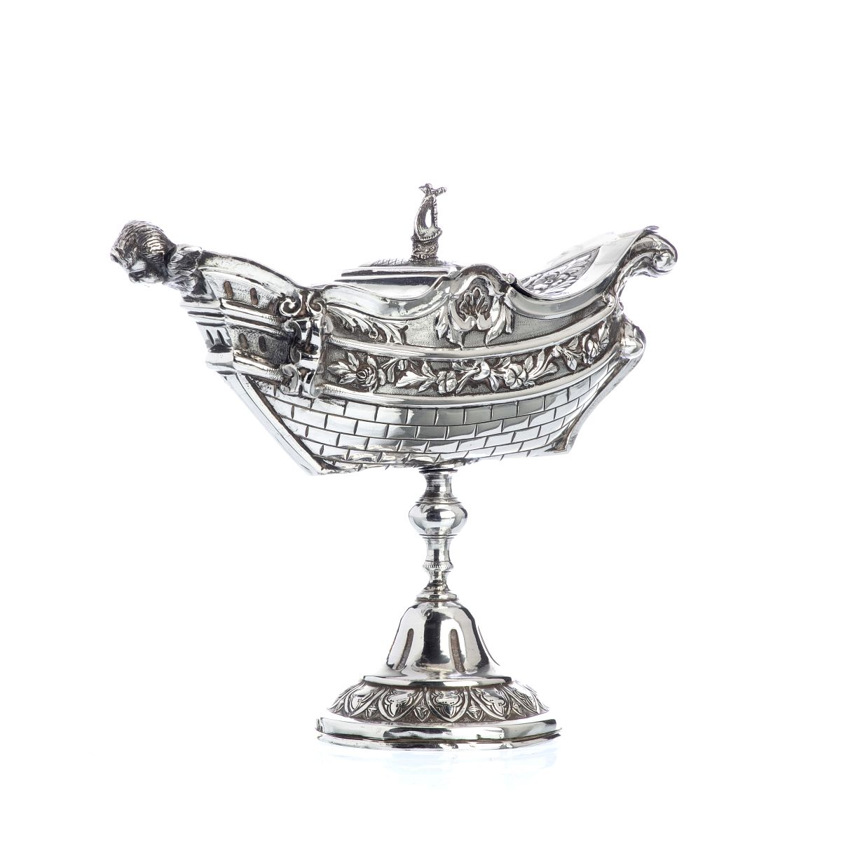 Prata portuguesa, contraste javali II 833 (1887-1937), decoração relevada com flores, cartelas, volutas e cabeça de querubim alada. Sinais de uso. Peso aprox.:272g. Dim.:19,5cm.