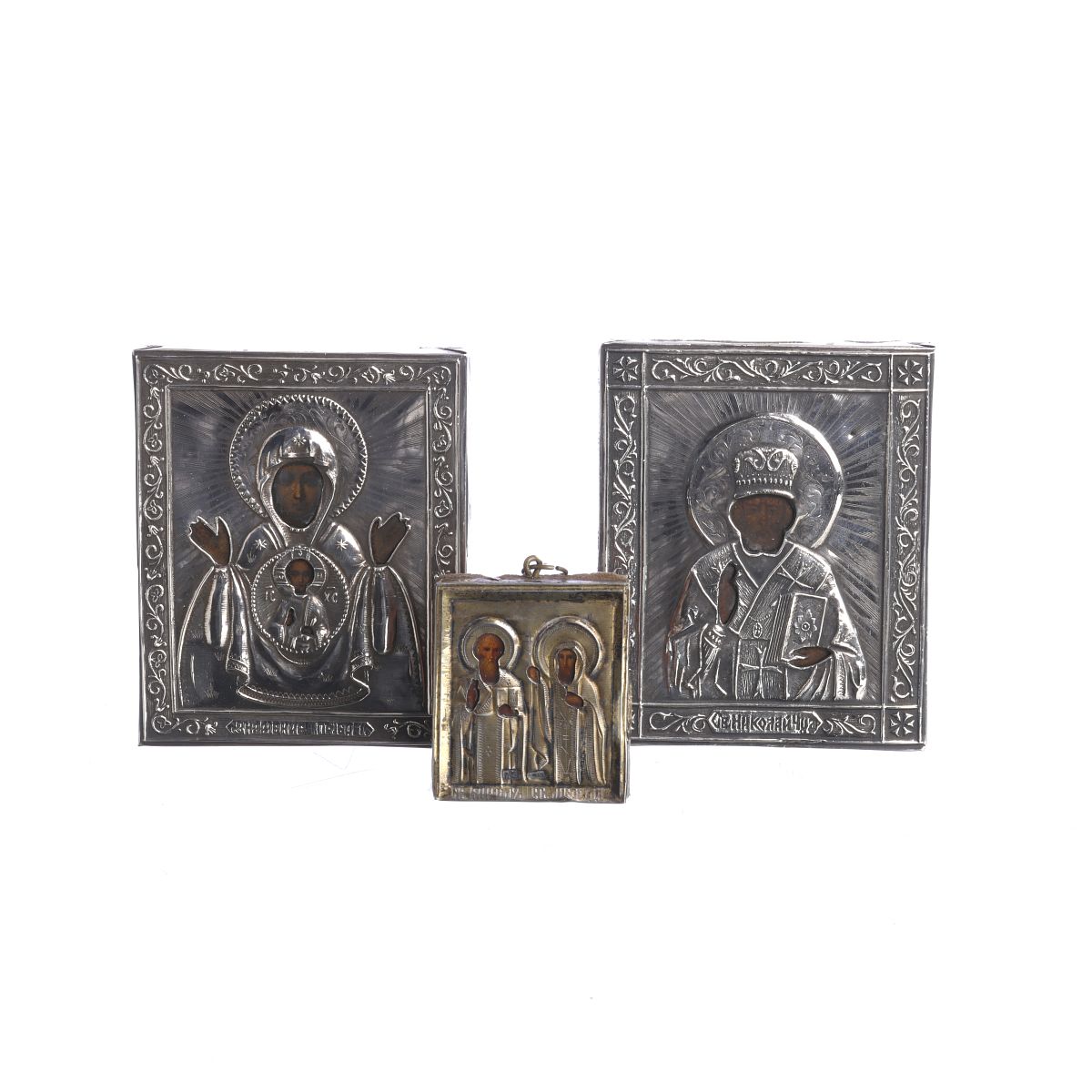 Óleo soebre madeira com aplicação em prata e prata dourada Russa 875, dois com marca de São Petersburgo, ourives Aleksandr Timofeyevich Shevyakov 1890, um com marca de Moscovo, ourive 'A.E.', recortada e relevada. Sinais de uso. Dim.: de 4,8cm a 8,8cm.