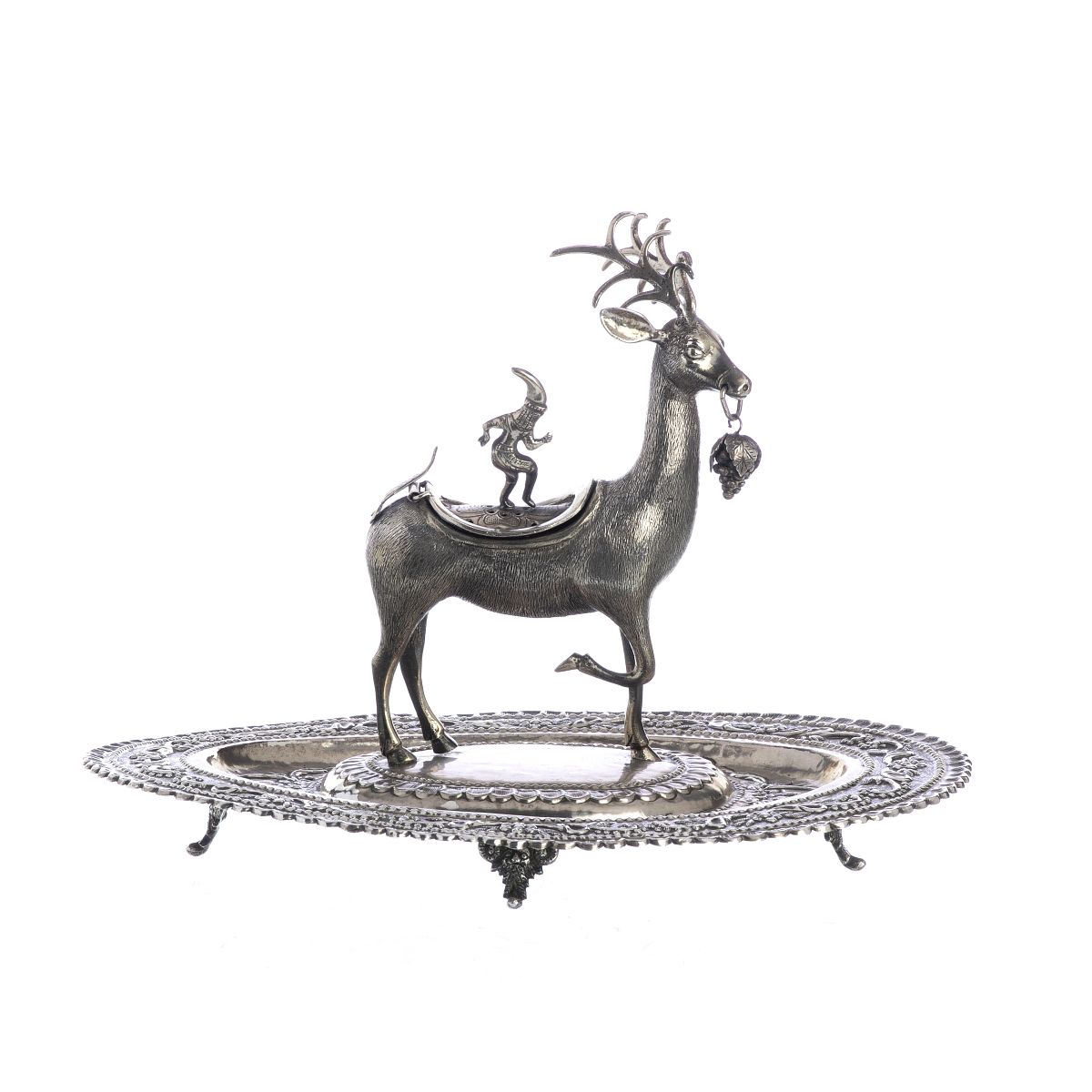 Prata colonial Espanhola, séc.XIX, recortada, com decoração cinzelada e relevada, representnando veado com frutos e figura, tabuleiro com flores e pés de mascarões. Sinais de uso. Peso aprox.:1066g. Dim.:29cm. Ao abrigo do Decreto-Lei nº120/2017.
