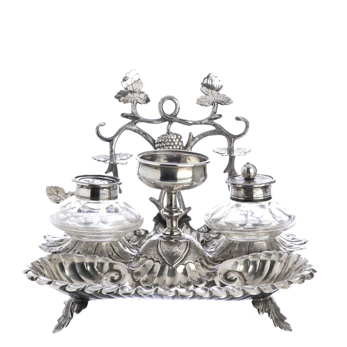 Prata portuguesa, contraste do Porto (1877-1881), marca de ourives atribuível a Guilherme Soares (1877-1886), decoração gomada e relevada, e com uva e parra, tinteiros em vidro. Faltam tampas, defeito. Peso aprox.:249g. Dim.:17,5cm.