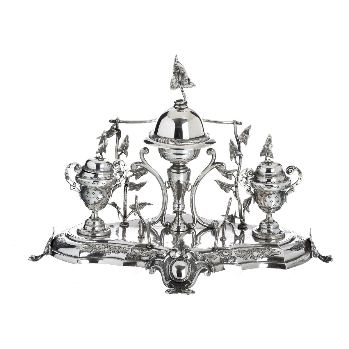 Prata portuguesa, contraste javali II 833 (1887-1937), decoração incisa e relevada com elementos vegetalistas e heras. Sinais de uso. Peso aprox.:704g. Dim.:29,5cm.