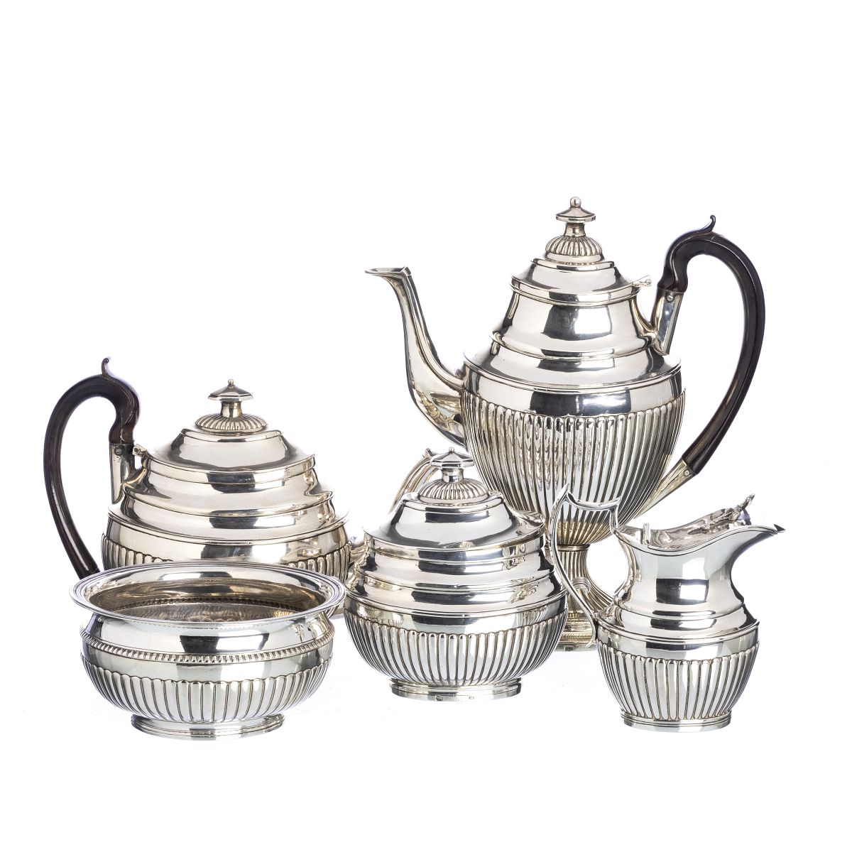 Prata portuguesa, contrastes do Porto (1810-1818) e (1810-1836), marcas de ourives (1810-1818) e (1810- 1810-1836), decoração de caninhas em relevo, pegas em madeira. Sinais de uso. Peso aprox.:3416g. Dim.:de 14,5cm a 29cm