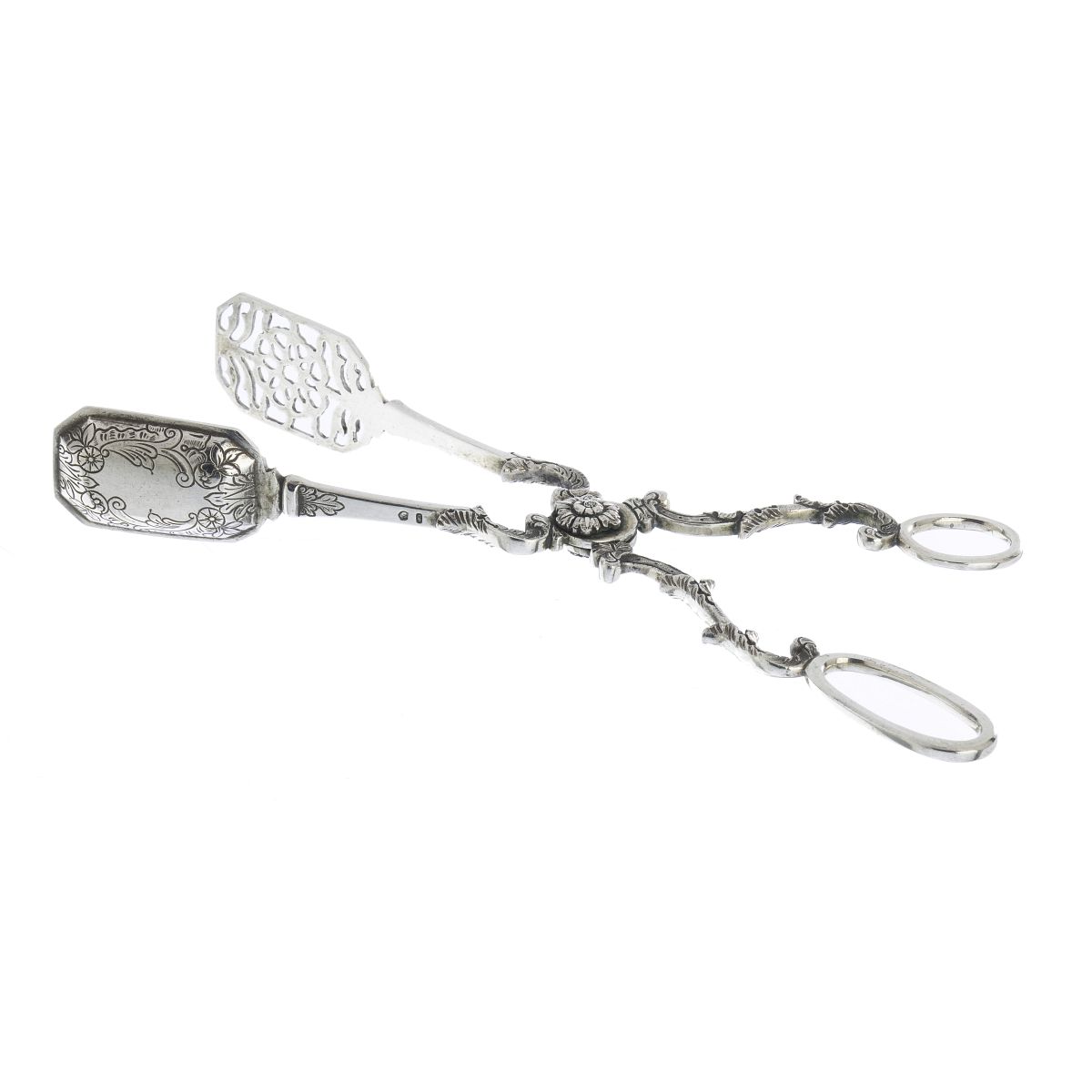 Prata portuguesa, contraste javali II 833 (1887-1937), decoração incisa, vazada e cinzelada de flores e volutas. Sinais de uso. Peso aprox.:207g. Dim.:28cm.