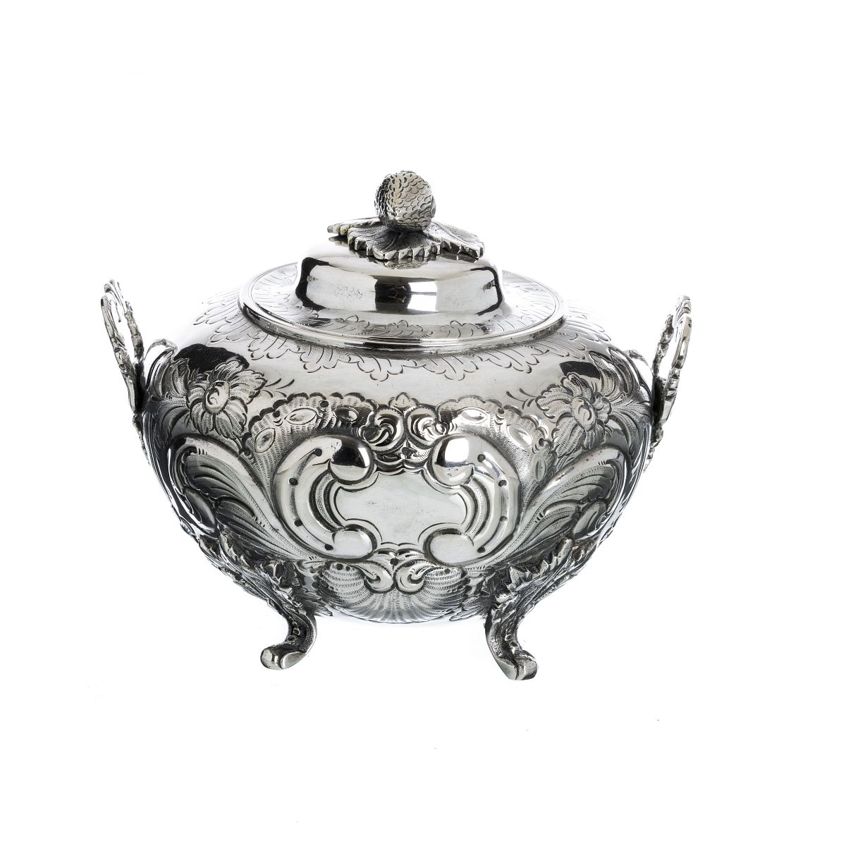 Prata portuguesa, contraste do Porto (reg.1861), marca de ourives (1861-1867), decoração relevada e cinzelada de flores, volutas e concheados, pomo em forma de murango. Ligeira amolgadela no corpo. Peso aprox.:519g. Dim.:16cm.