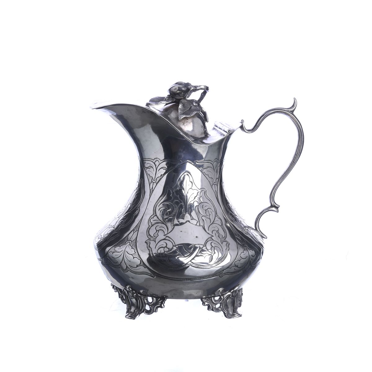 Prata portuguesa, contraste do Porto (1877-1881), marca de ourives João Joaquim Monteiro & Filho (1870-1881), decoração vegetalista incisa, pés vazados e pomo relevado com fruto. Sinais de uso. Peso aprox.:455g. Dim.:15cm.