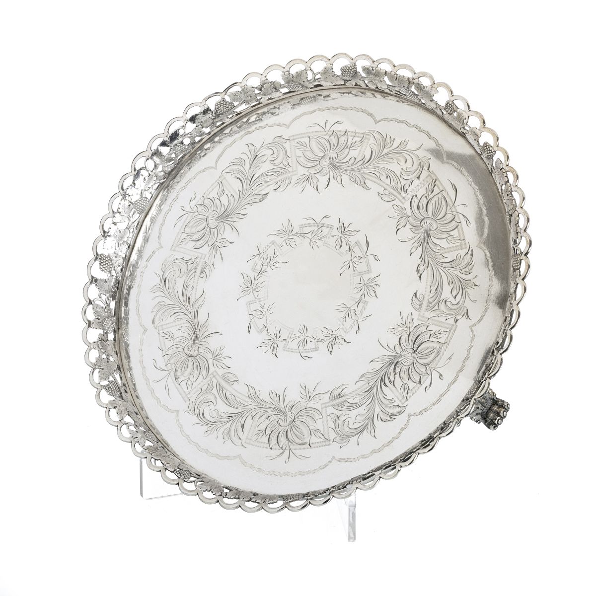 Prata portuguesa, contraste do Porto (1861-1867), marca de ourives (1861-1867), decoração vegetalista incisa, com gradinha de uva e parra, com três pés de garra. Sinais de uso. Peso aprox.:607g. Dim.:26,5cm.