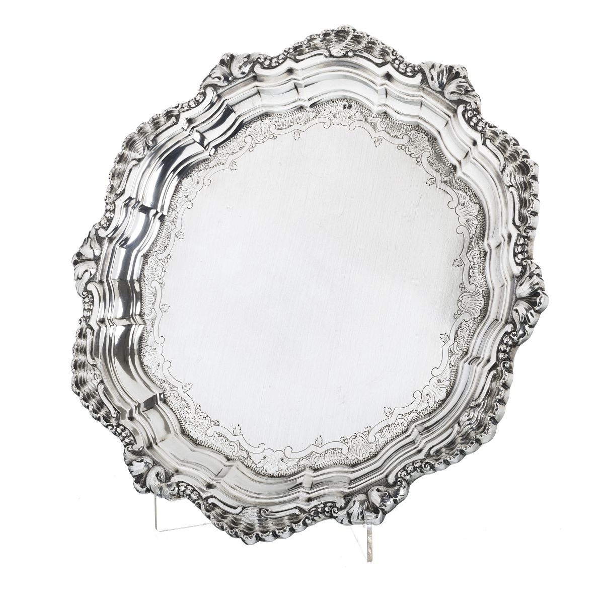 Prata portuguesa, contraste águia 833 (1938-1984), recortada com decoração incisa e relevada de volutas, concheados e elementos vegetalistas. Sinais de uso. Peso aprox:814g. Dim.:35,5cm.