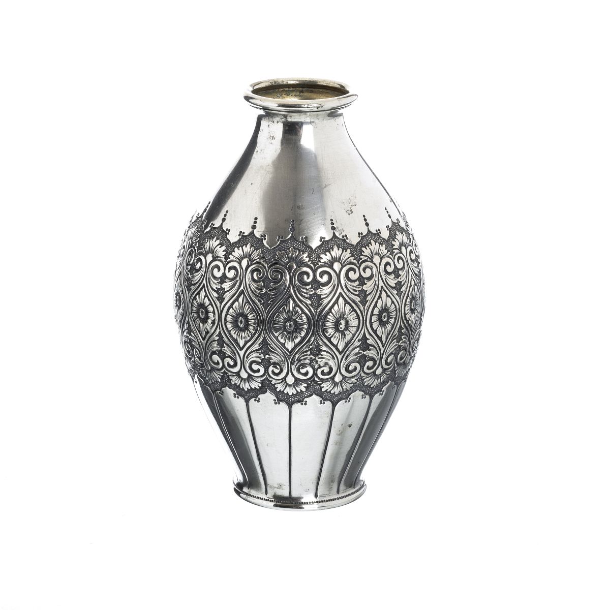 Prata portuguesa, contraste javali II 833 (1887-1937), decoração relevada de flores e volutas. Sinais de uso.Peso aprox.:194g. Dim.:17cm.